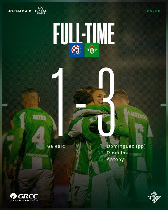 北京时间12月12日01:45,欧联杯联赛阶段第6轮,皇家贝蒂斯客场挑战萨格勒布迪纳摩。上半场里克尔梅破门+造乌龙,巴坎布送助攻,安东尼扩大比分,下半场伽列西奇头球扳回一城,巴坎布离谱失空门。最终皇家贝蒂斯客场3-1战胜萨格勒布迪纳摩,贝蒂斯欧联6轮不败+3连胜。